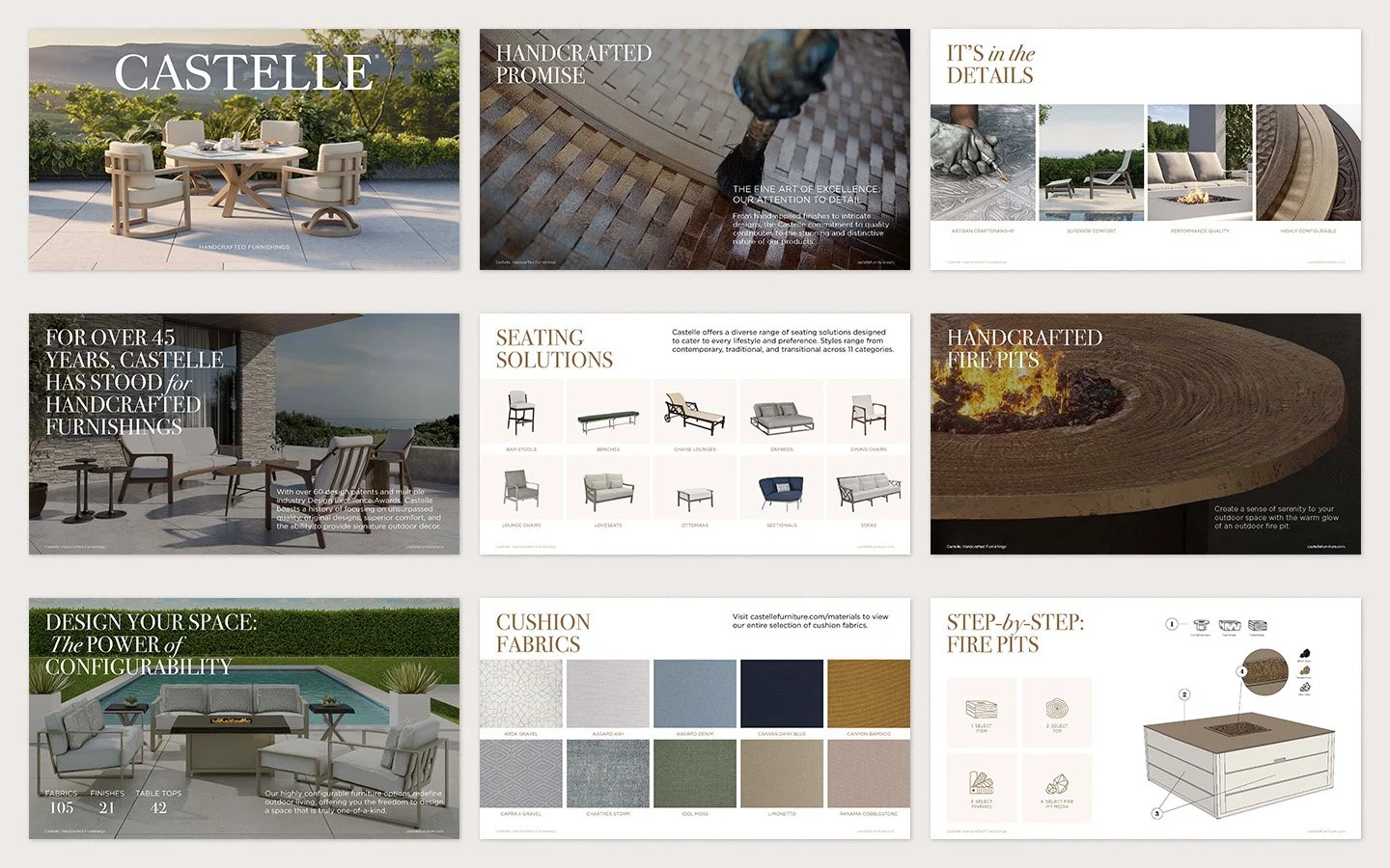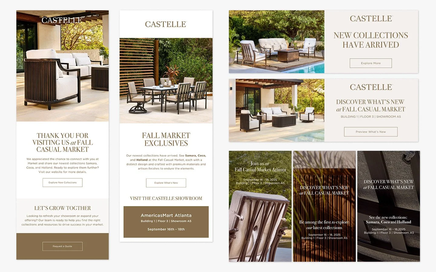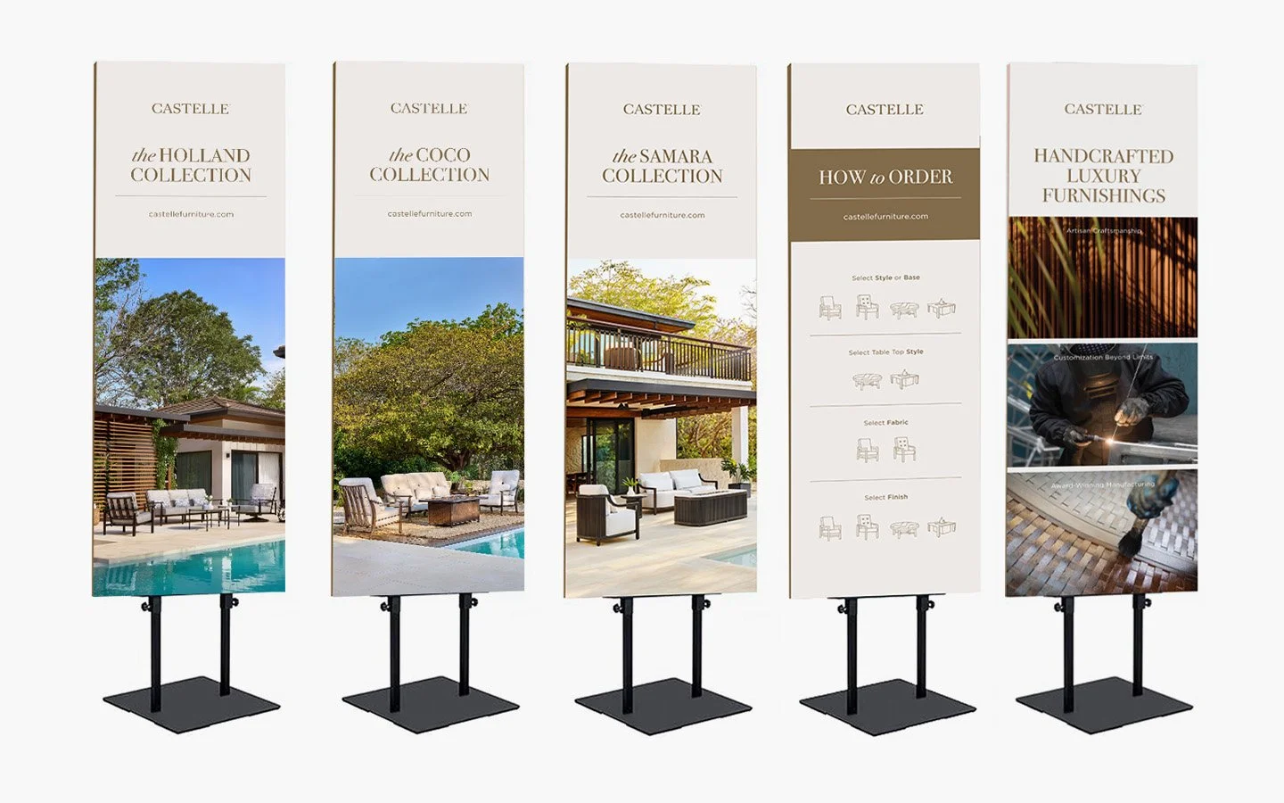 For over 40 years, Castelle has been known for handcrafted luxury outdoor patio furniture. As Senior Graphic Designer for Brown Jordan Inc., I ran art direction and assisting with graphic creation for Castelle Furniture across numerous campaigns and across multiple channels. Below are a few samples of that work.
